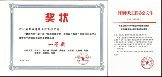 9月18日,公司收到中國市政工程協(xié)會(huì )《關(guān)于公布2023年度全國市政工程建設優(yōu)秀質(zhì)量管理小組獲獎名單的通知》文件,公司推薦參賽的成果獲得一等獎。